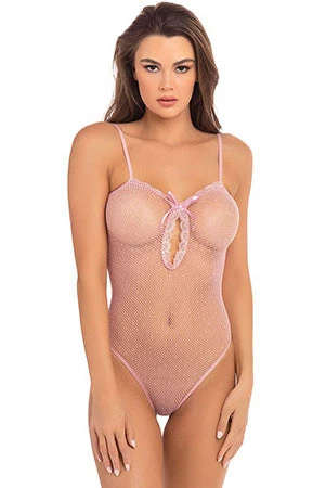 Give your babe some extra love in this sexy teddy featuring sheer dotted mesh cups with a scalloped trim, spaghetti straps, a satin bow accent, a small front keyhole, a sheer dotted mesh bodice, and a cheeky cut back.