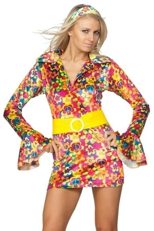 Psychedelic Sally Costume features a floral velvet dress with bell sleeves and headband. (Belt not included)
