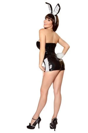 Includes black and white bunny-ear headband, strapless top with tuexedo detail, and sequin shorts
