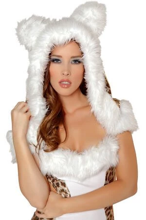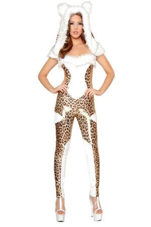 Cat suit includes cheetak print with white patching detail and front furt lining