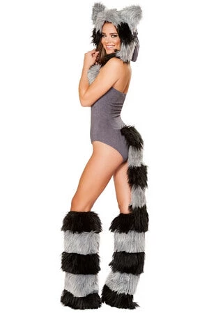 Furry Raccoon Costume includes a detachable hooded romper with fur trim and fur tail.