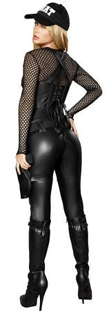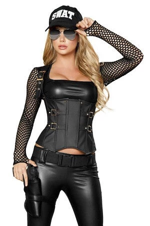 They’ll want to be stopped and frisked when you show up! 5 piece costume includes long sleeve crop top, waist cincher with strap details, pants, belt, and holster with gun for laying down the law at any costume party!!