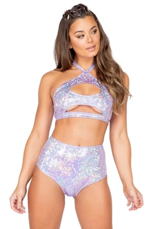 High neckline with halter straps rave crop top with underboob cut out detail. A perfect complement to Roma Costume’s 3841 shorts (sold separately).