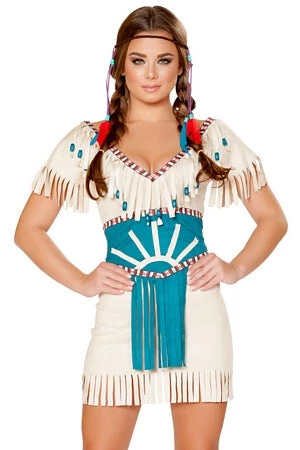 Tribal Babe Costume includes a mini dress with fringe and bead detail and waist cincher with fringe detail.