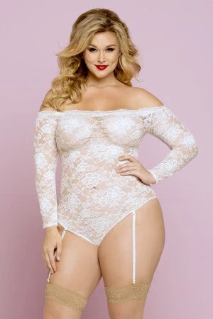 Floral lace long sleeve off the shoulder teddy with lace trim, removable garters, and snap crotch.