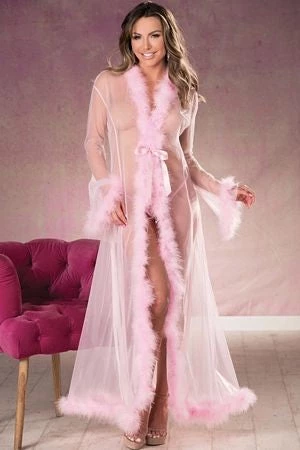 This pink movie star sheer robe features long sleeves, ribbon tie front and marabou trim. Black is listed separately. **Sizing Note – One Size should work for you, if you normally wear XS, SM, MED, and sometimes LG.