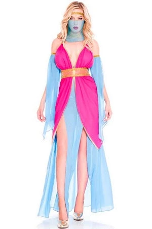Twist you’re hips in a hypnotic sexy dance in this Harem Princess costume featuring a pink and blue dress with a deep-V neckline, gold trim, halter straps, sheer gold belt, back zipper closure, long skirt with two high front slits, draping blue sleeves with gold cuffs, gold choker, matching headband, and a sheer blue face mask.