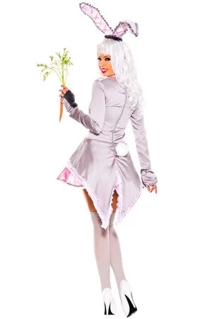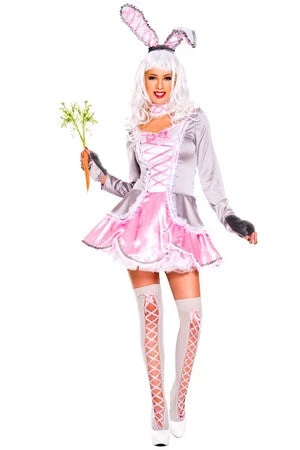 Follow Me Rabbit Costume includes a lace-up dress with long tuxedo tail, bunny ears, choker, gloves, plush tail and thigh highs.