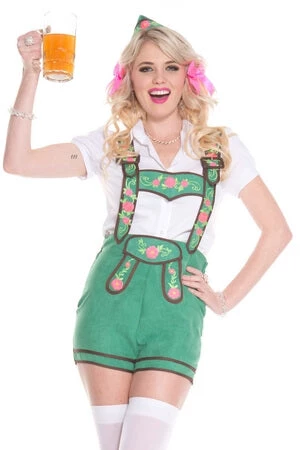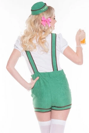 5 pc. High waisted Bavarian shorts with H-shaped suspenders and white collared shirt with floral brocade trim. Includes: hat and 2 oversize hair bows.