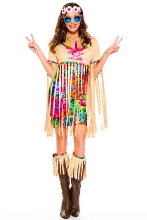 Retro Hipster Costume includes a shredded multicolor dress, headband, leg wraps and glasses.