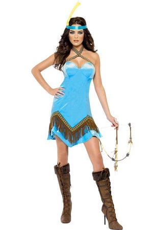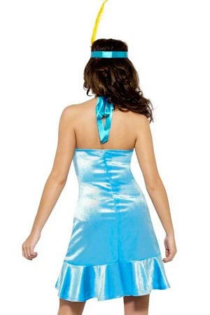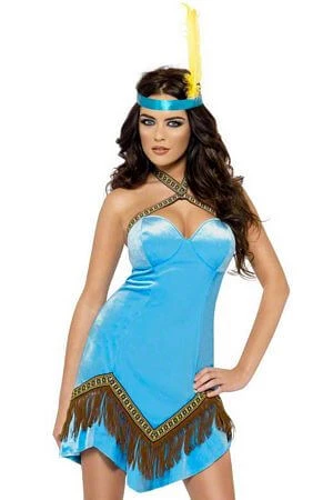 Indian costume features aqua blue dress with brown fringes towards the bottom and matching aqua headband with feather.