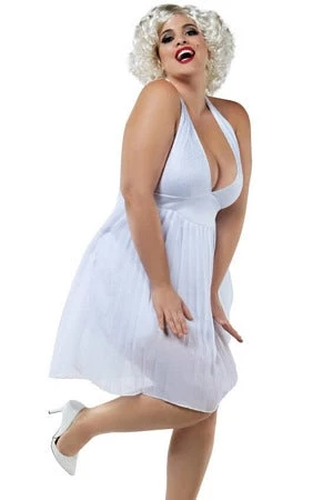 Be a showstopper in our Blonde Bombshell costume featuring a white dress with an allover sparkling design, deep V neckline, halter tie strap, form fitting mini skirt under a sheer, pleated overlay. (Wig not included.)