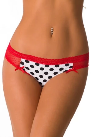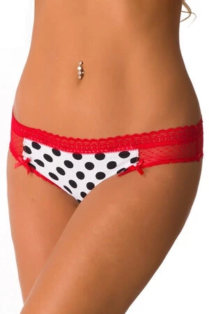 Red dotted mesh hipster with an polka dot print front design and lace trim.