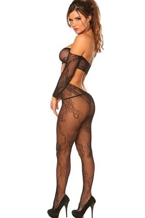 This asymmetric fishnet bodystocking features an elegant floral print, one long sleeve on one side, strappy tank on the other, cutout bodice, and open crotch.