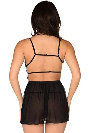 Seduce your lover in this open cup cage style black chemise. Features eyelash lace detailing on the cup, adjustable straps and matching g-sting.