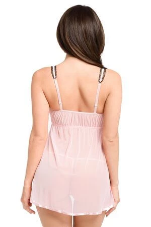 This sheer mesh babydoll features contrasting black scalloped lace details, ribbon hem, satin bow accent, adjustable lace straps, and a matching g-string.
