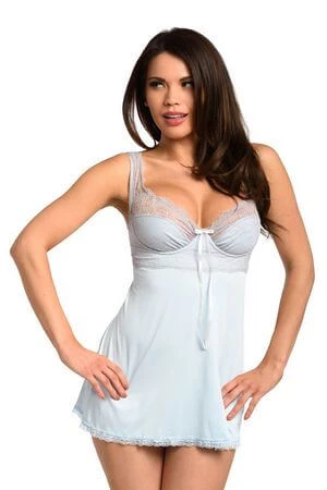 Babydoll features a solid baby blue bodice with a sheer grey lace top, off the shoulder design, underwire cups, scalloped lace straps, small keyhole back with hook and eye closure, lace hem, and front bow accent.