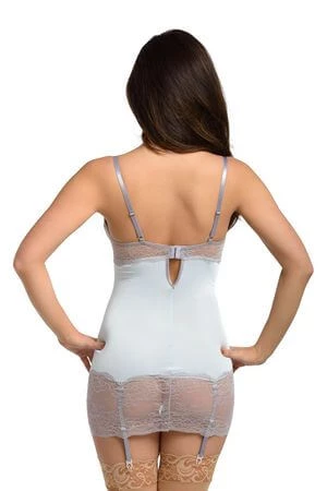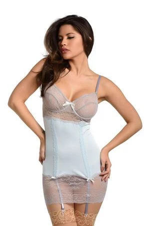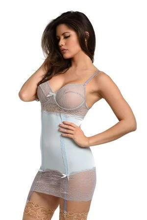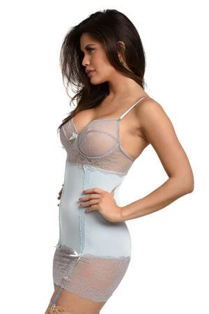 Chemise features a solid baby blue bodice with a sheer grey lace top, unlined underwire cups, adjustable spaghetti straps, small keyhole back with hook and eye closure, scalloped lace hem, satin ribbon accents, and removable garters.