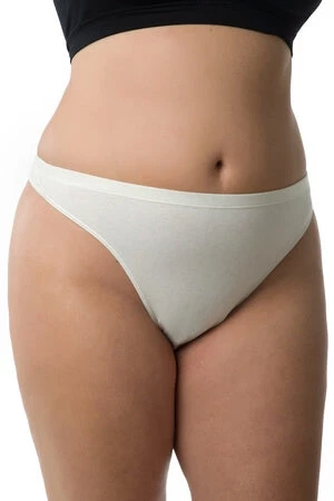 Ivory knit spandex thong with elastic waist. 95% Cotton, 5% Spandex.