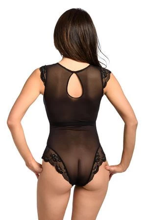 Hug your curves in this sexy sheer mesh bodysuit featuring delicate lace overlay, a plunging sheer mesh panel, flutter cap sleeves, high scoop neckline, solid waistband, a ruffled lace hem, and a keyhole back with button closure.