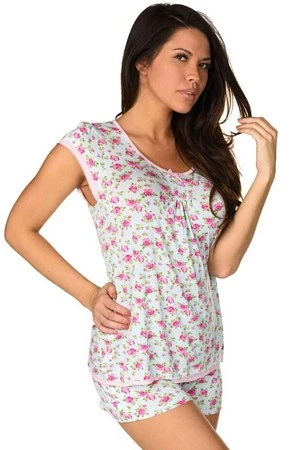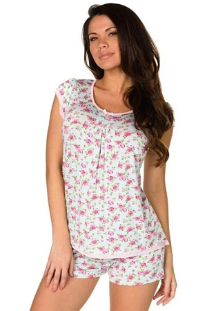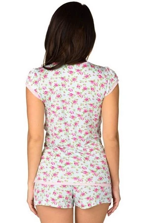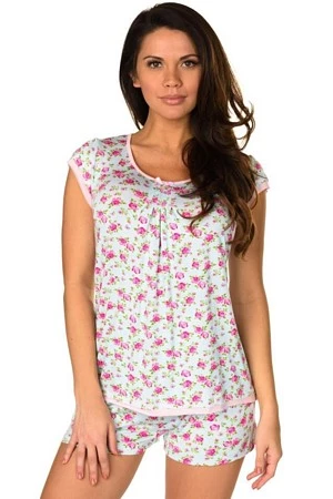 Short set features a floral print, pink trim scoop neck, satin bow and pleating to accentuate your decolletage. Cap sleeves and top have an unfinished hem and layered pink peek-a-boo detail. Shorts include an elastic waistband for comfort and satin bow detail. 95% Rayon, 5% Spandex