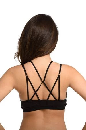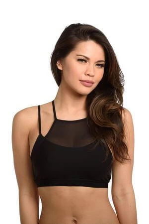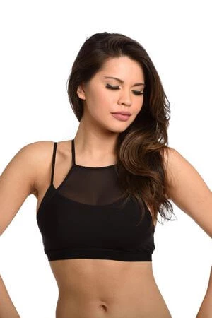 Sports bra features a high neckline, mesh overlay, adjustable spaghetti straps, elastic underbust band, and a multi-strapped back. 90% Nylon, 10% Spandex
