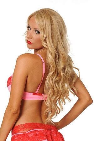 This bright pink bra features a lightly lined cup with a little padding for lift, adorned with contrasting red lace over the cups and red satin bows, adjustable shoulder straps and bra closure. Pair with matching garter skirt to complete the look.