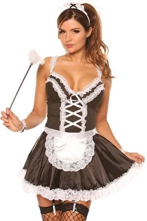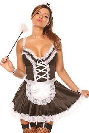 This seductive Maid for you costume features a satin like dress with white ruffle lace, adjustable shoulder straps, tie back apron, faux lace up front, adjustable garter straps, feather tickler, lace headband and lace wrist cuffs.