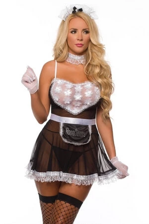Cleaning up never looked so sexy than in this sexy french maid costume featuring a black and white mesh dress with floral details, ruffled hem, adjustable spaghetti straps, “Room Service” apron, neck collar with hook and eye closure, matching thong, headband, fishnet gloves, and fishnet thigh high stockings.