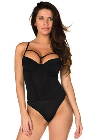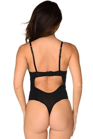 You’ll capture all the attention when you wear the One Liner Bodysuit! Bodysuit features a cage set bra with molded underwire cups, sheer center panel on bodice, low scoop back with cheeky thong bottom. Hook and eye closure. 90% Nylon, 10% Spandex
