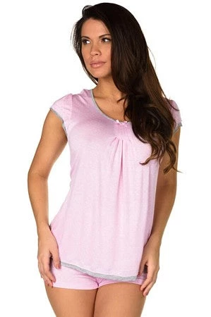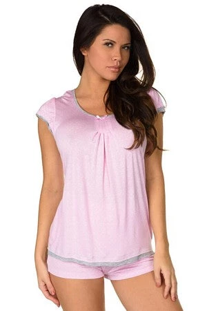Short set features a pink and white polka dot print, grey trim scoop neck, satin bow and pleating to accentuate your decolletage. Cap sleeves and top have an unfinished hem and layered heather grey peek-a-boo detail. Shorts include an elastic waistband for comfort and satin bow detail. 95% Rayon, 5% Spandex