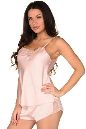 Feel sensual when you slip into this satin like pink cami and short set. Features adjustable straps and V lace detailing for an elegant look.