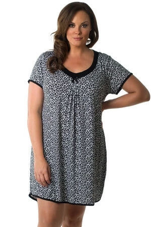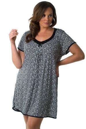 Super soft animal print sleep shirt features short sleeves and a scoop neckline. 95% Rayon, 5% Spandex.