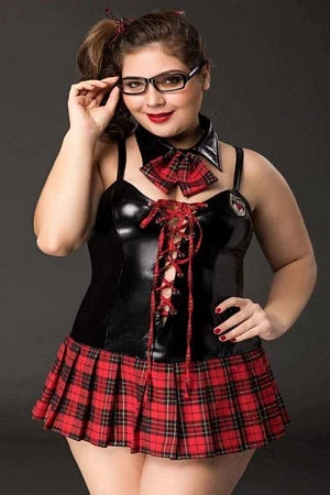 Queen School Me Costume features a wet look chemise with an attached plaid skirt, zipper back and lace-up front, hair ties, collar, glasses and panty.