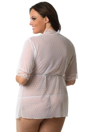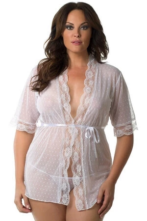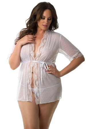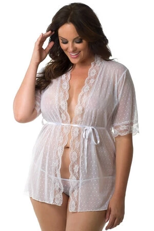 Three piece robe set includes robe with scalloped lace trim, short sleeves, waist tie, and matching G-String.
