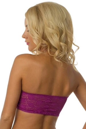 Purple Future Royalty Lace bandeau bra features lined bust with removable lightly padded cups and sheer lace back. Lace 90% Nylon, 10% Spandex. Lining 93% Polyester, 7% Spandex.