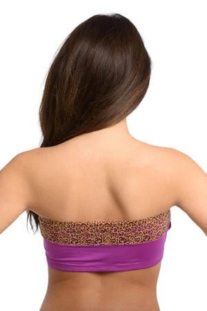 This purple strapless bandeau bra top features leopard print lace detailing, removable padding, a cinched front, and stretchy fabric. 90% Nylon, 10% Spandex