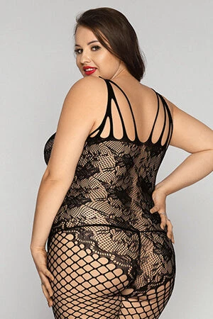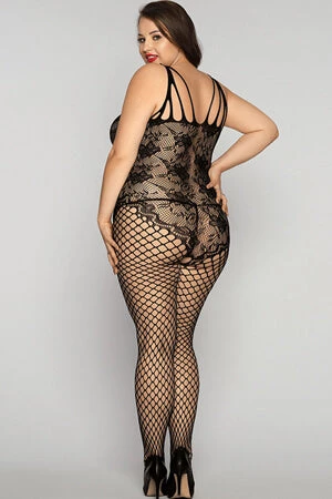 Spark your partner’s interest in this ultra-sexy plus size bodystocking featuring sheer floral lace bodice and fishnet legs. (Panty not included.)