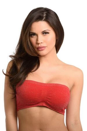 This strapless bandeau bra top features a sparkly front, removable padding, a cinched front, sheer lace back, and stretchy fabric. 92% Nylon, 8% Spandex
