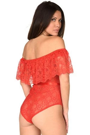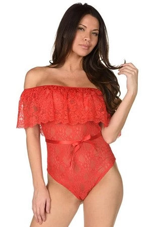 Our sassy Senorita Lace Teddy will have you feeling sexy and beautiful. It’s worn off the shoulder with lace ruffle detailing, ribbon tie belt and a Brazilian cut back.