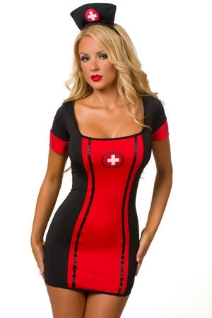 You’ll be ready for an exciting night shift with the Velvet Kitten Sexy Night Nurse Costume from Lingerie Diva! This black and red naughty nurse costume can be worn during private role-playing adventures or out on the town at Halloween thanks to the sexy tube-style stretch dress and sweet detailing. Featuring front ribbons, a ribbon lace-up back and screen-printed graphics for an authentic approach, this sexy nurse costume is the perfect pick for a wide range of extra-special occasions. It even comes with the classic nurse headpiece for a tied-together look. Pair it with some sexy panties in black or red from Lingerie Diva for a special surprise underneath!
