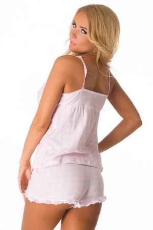 Pink and white plaid two piece pajama set features a cami top with scoop neckline, adjustable shoulder straps, empire waist, ruffle details, and matching shorts with an elastic waistband. 95% Cotton, 5% Spandex