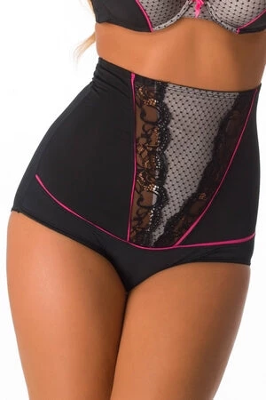 Black high waisted brief with dotted mesh and floral lace front panel. 90% Polyester, 10% Spandex