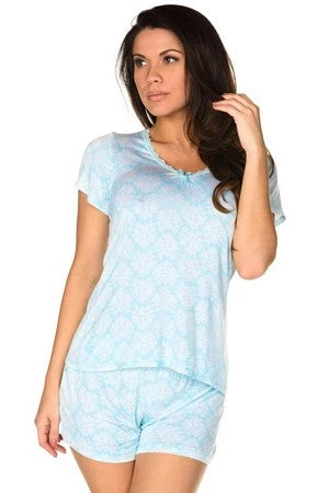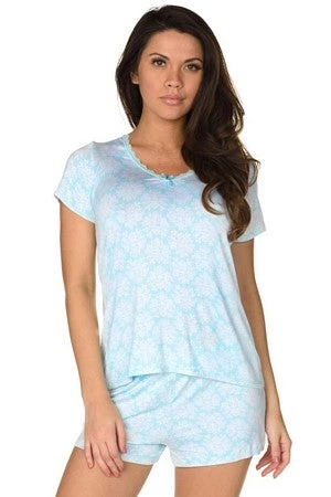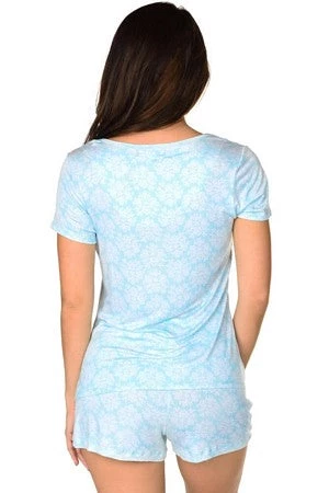 This set will have you have begging for breakfast in bed! Sleepshirt has a laced v-neck, satin bow, and ruching. Sleep shorts feature an elastic waistband with lace detailing, satin bow, and faux pocket detailing with lace and rhinestones. 95% Rayon, 5% Spandex
