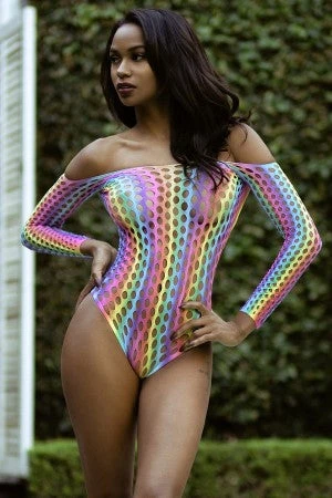 Get ready for your lively night in this colorful rainbow bodysuit! Featuring a circle cut-out fishnet design, this off shoulder bodysuit has long sleeves, a low cut open-back, and a thong bottom.